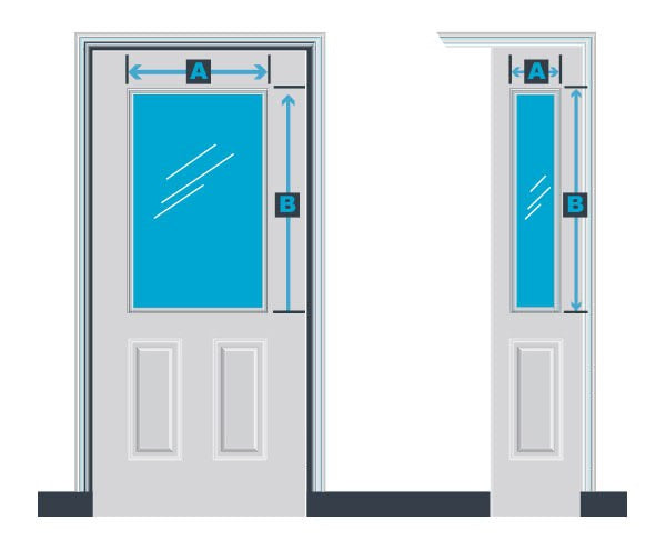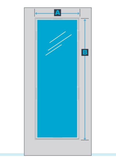 Dimension B: Measure the raised molding surrounding the existing glass from outside edge to outside edge, vertically top to bottom.